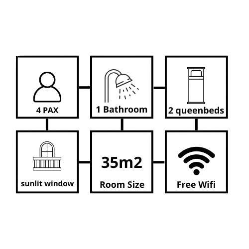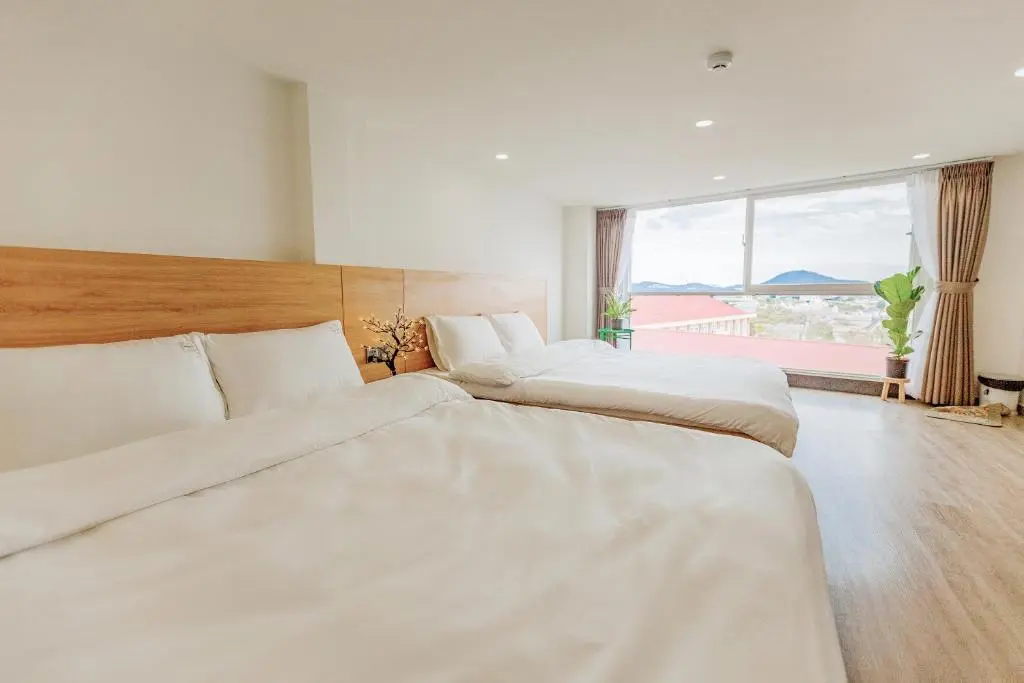The Quadruple Room offers a spacious 35m² layout designed for comfort and togetherness. With a sunlit window overlooking the city, a full-body mirror, and a full range of modern amenities, the room brings both style and convenience to your stay. Perfect for groups of four or small families, it’s an inviting space to relax, connect, and enjoy Da Lat from a bright, cozy vantage point.