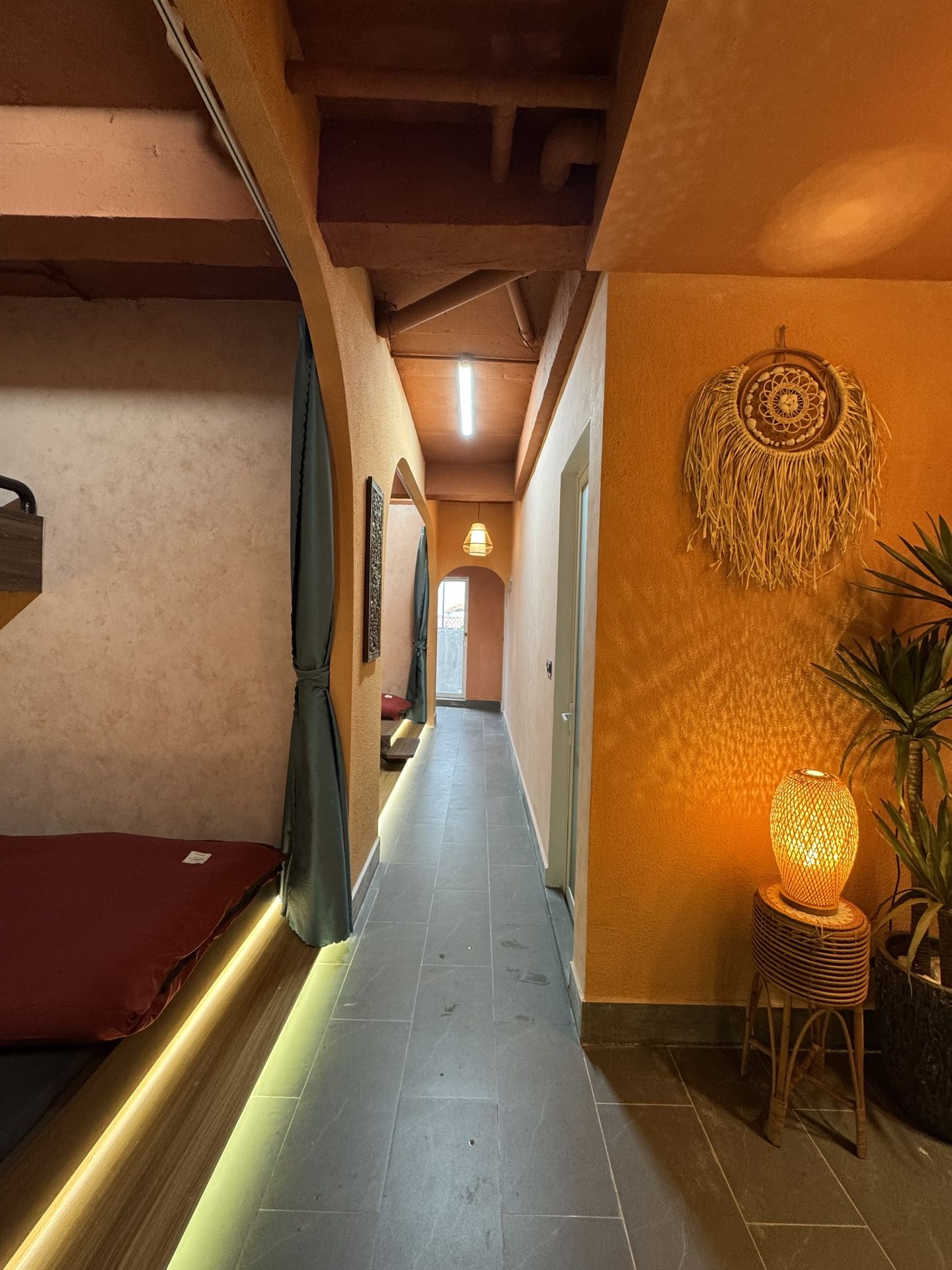 The Family 2.0 Room offers the perfect shared space for large groups, featuring 4 double beds and 4 single beds for 10–12 guests. Designed in warm desert tones — burgundy red and earthy orange — it brings a cozy, “dream-catcher” vibe, ideal for families or groups who love staying together in one spacious, stylish room.